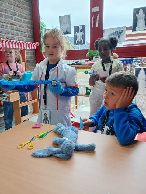 Terwijl sommigen ijverig nieuwe woorden leerden en opschreven, waren anderen bezig met het verzorgen van ‘gewonde’ knuffels als dierenarts. Zo brachten we de leerstof 茅cht tot leven.