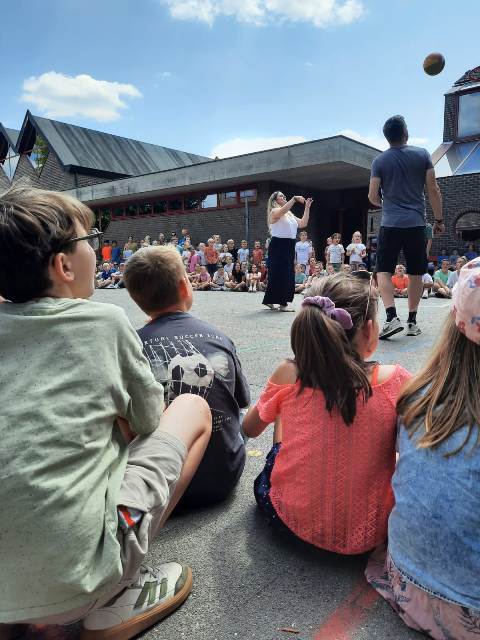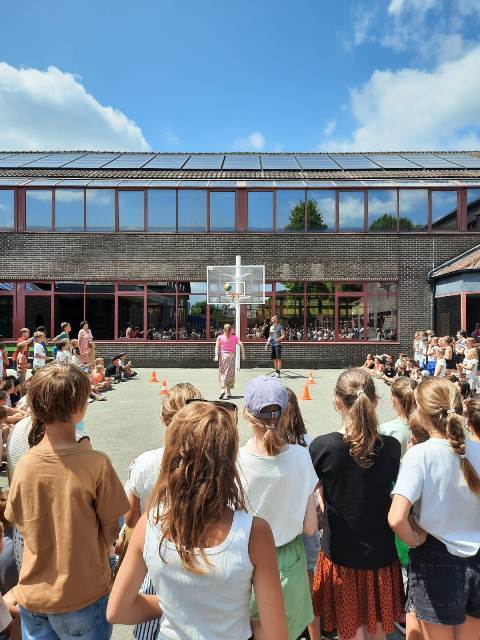 Aansluitend toonden de juffen en meesters hun werptechnieken tijdens het basketwerpen.